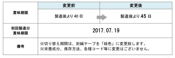 製品の製造実績と保存性再確認の結果、品質上問題がないと確認されました。2017年6月5日製造分より、賞味期限を「製造後より45日」に変更(5日延長)致します。