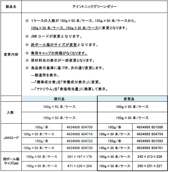 この度、弊社製品「アイソトニックグリーンゼリー」につきまして、製造工場の変更に伴い、入数および栄養成分表示、JANコードなどが変更となります。