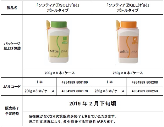 この度、ご愛顧いただいております弊社製品「ソフティア①SOL(ゾル)」「ソフティア②GEL(ゲル)」ボトルタイプにつきまして、誠に勝手ではございますが、在庫がなくなり次第、販売を終了することになりましたのでご案内いたします。なお、その他ラインナップにつきましては継続販売いたします。
