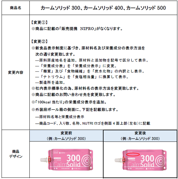 「カームソリッド」新食品表示制度への対応に伴う包装表示変更のご案内