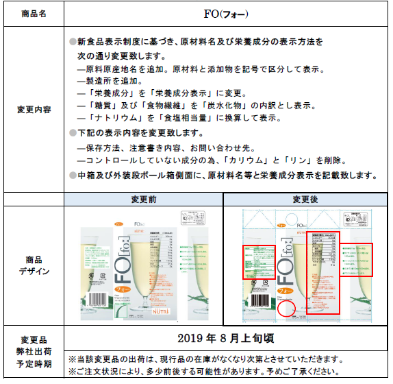 この度、弊社製品「FO(フォー)」につきまして、新食品表示制度に基づき、パッケージの表示内容を変更することとなりましたのでご案内いたします。