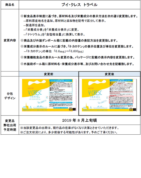 この度、弊社製品「ブイ・クレス トラベル」につきまして、新食品表示制度に基づき、原材料名等の表示内容を変更することとなりましたのでご案内いたします。