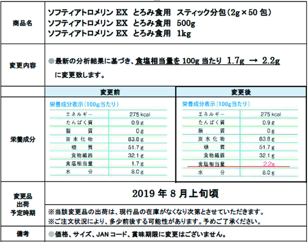 この度、弊社製品「ソフティア トロメリンEX(イーエックス)」につきまして、最新の分析結果に基づき、食塩相当量を変更することとなりましたのでご案内いたします。