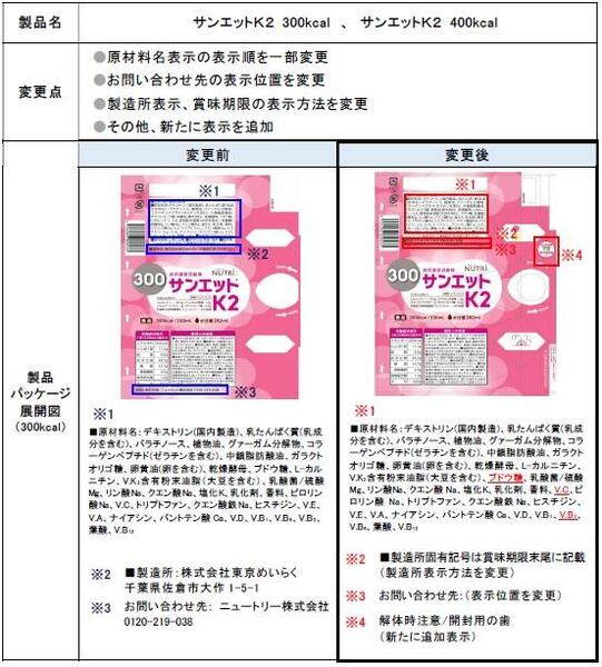 この度、弊社製品「サンエットK2」300kcal、400kcalにつきまして、製品パッケージと外箱段ボール箱の表示を一部変更することとなりましたのでご案内いたます。