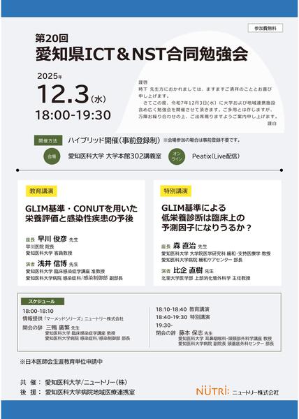 ニュートリー株式会社は 愛知医科大学と共催で医療・介護従事者を対象に、第20回愛知県ICT&NST合同勉強会を開催いたします。