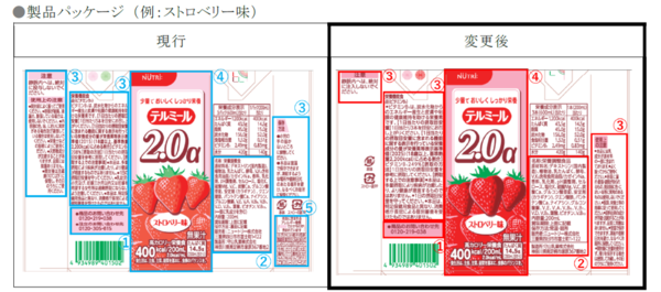 この度、弊社製品「テルミール2.0α」各種につきまして、製品パッケージおよび外装段ボール箱の表示変更を行うこととなりましたので、ご案内申し上げます。また、ストロベリー味につきましては、製品パッケージの色味も併せて変更いたします。
