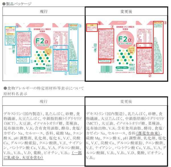 この度、弊社製品「エフツーアルファ」ミックスフルーツ風味につきまして、製品パッケージおよび外装段ボール箱の表示内容を一部変更することとなりましたので、ご案内申し上げます。