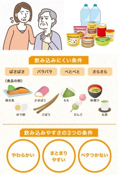 災害時の食事にまつわるさまざまなリスクを避けるためには、飲み込みやすさの3 つの条件「やわらかい、まとまりやすい、ベタつかない」を満たす食品を備蓄することが大切です。こうした食べやすさへの配慮は、むせのリスクを減らし、安全に食事を続けることに繋がります。
